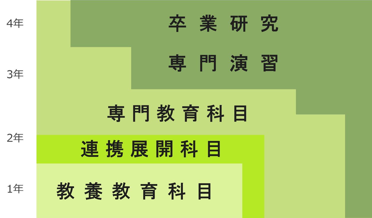 (教養教育科目:30単位、専門教育科目:76単位、自由選択科目:4単位、専門演習:14単位、卒業研究:4単位)