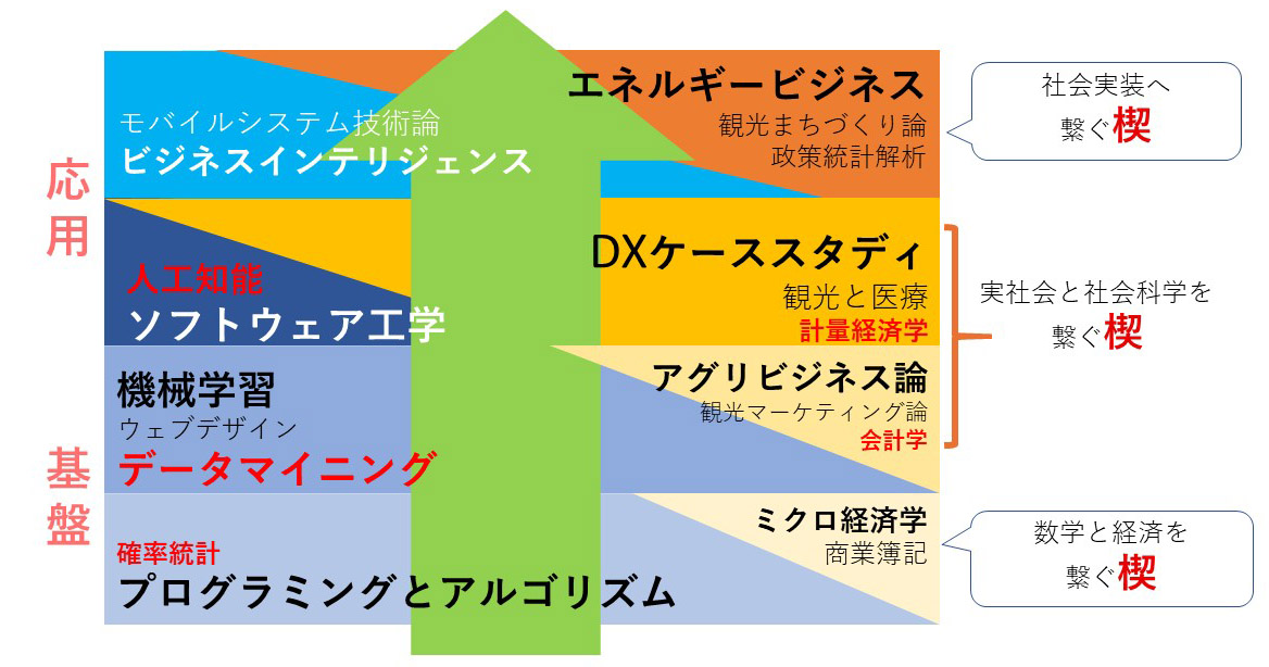 ミクロ経済学や観光マーケティングなどの経済学・観光学分野における主要な知識を身に付け多様な社会活動を把握・理解できる能力を養うことや、プログラミングや人工知能などの工学分野における情報技術を用いたデータ分析にかかる基盤となりかつ汎用性の高い能力を涵養することを目的とした科目